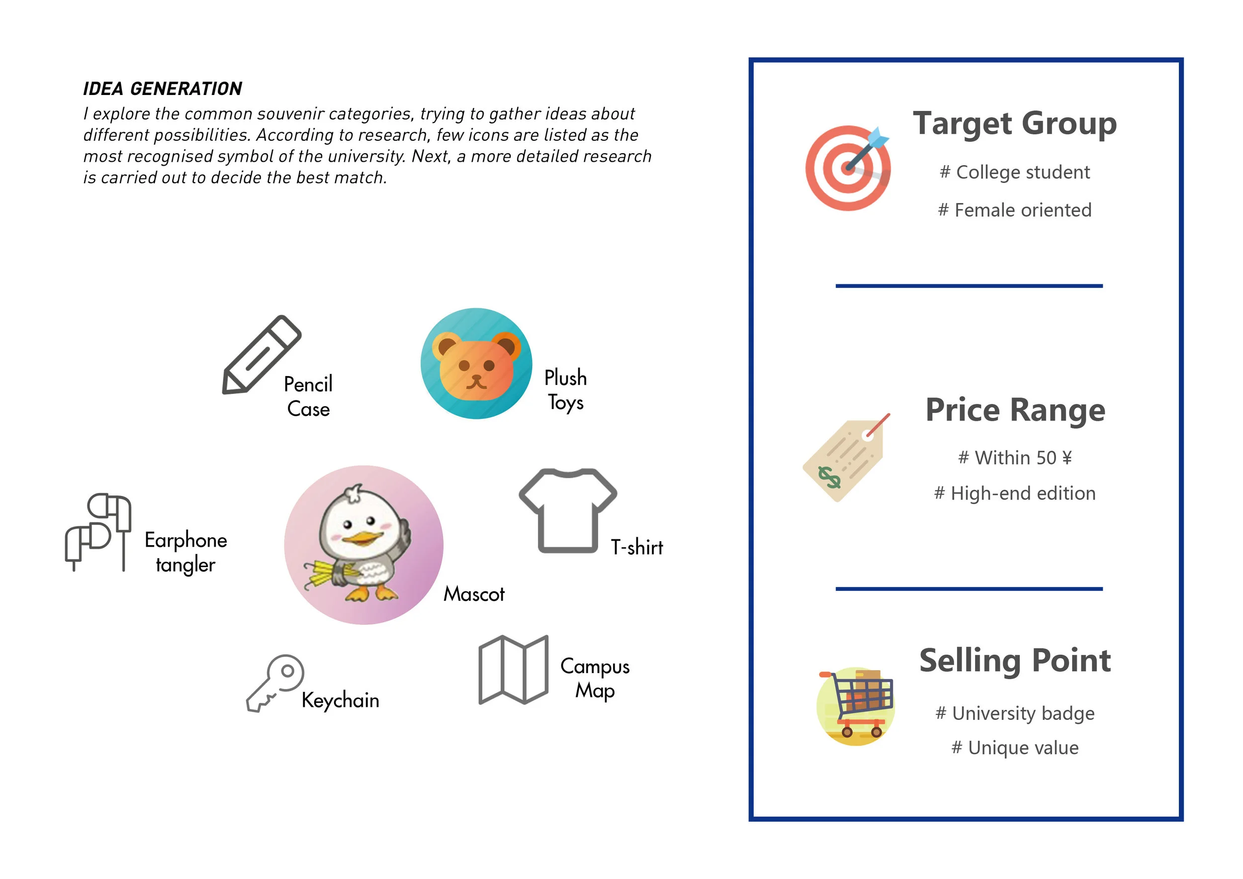 The souvenir design project starts with the attempt to re-create the university symbol and further develop it into a commercial start-up. Based on market research, the final design is narrowed down to the university badge with the function of a key holder. It could be a useful tool for college students with their needs to carry around certain numbers of keys as the daily carry. Aside from the functional part, the memorable meaning under this item is also a unique selling point. Castle is the symbol of protection, so it naturally connects to the item key which requires a sense of protection.