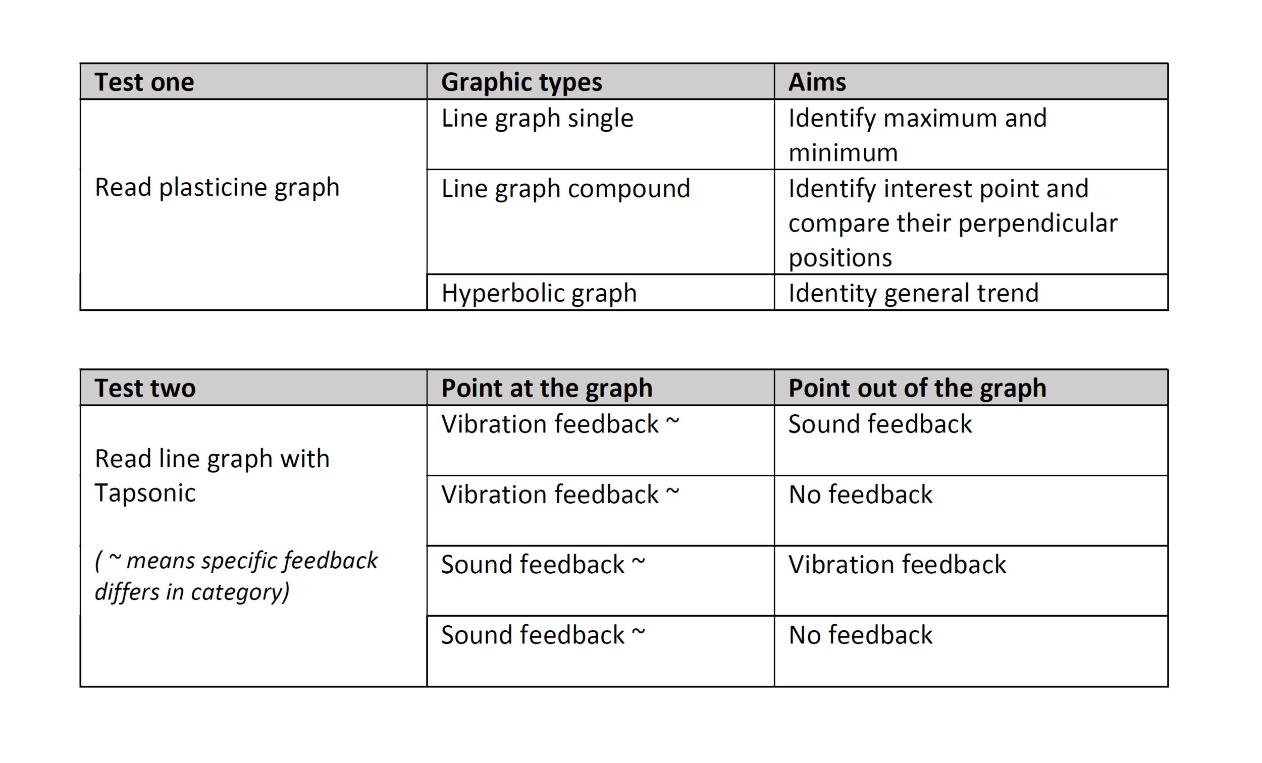 The test findings that precious technology focuses on interpreting and explaining graphics information in a more implicit way, such as the patterns rather than finding details on the graphics. And when it comes to accurate graphical readings, solely relied on tactile feedback may not able to achieve the desired results. Supporting tactile reading by explicit verbal explanation could be a solution for the visually impaired group.