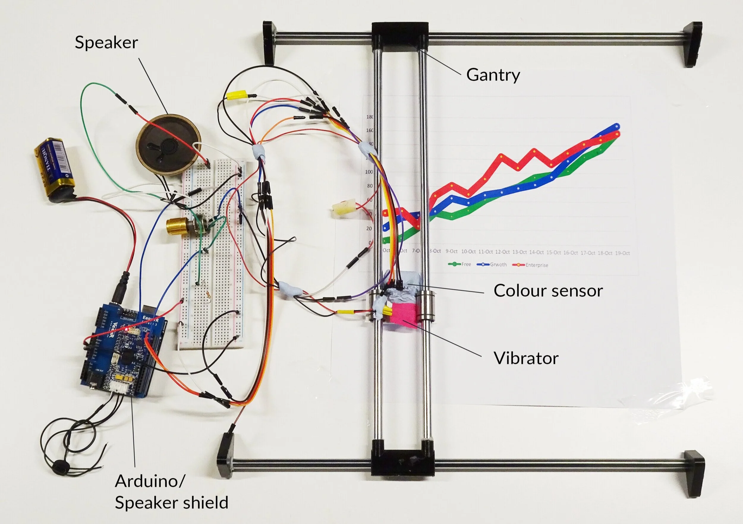Responding to the previous quesitons, we proposed a low cost prototype system based on Arduino. The initial prototype consists of a gantry system, vibration motor, colour sensor, Arduino and speakers.